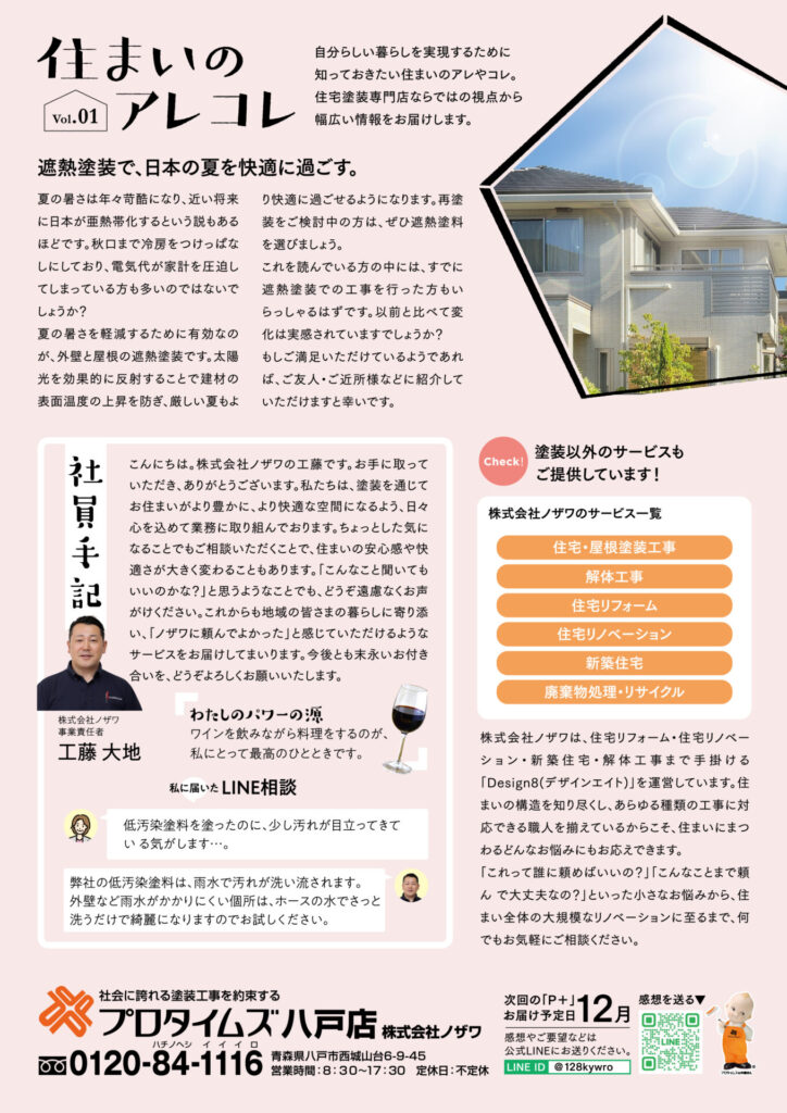 HOME ブログ 🎉 ニュースレター創刊のお知らせ スタッフブログ 🎉 ニュースレター創刊のお知らせ 2025.07.01 スタッフブログ みなさん こんにちは!八戸市の外壁塗装屋根塗装 外装リフォーム専門店の株式会社ノザワ プロタイムズ八戸店です! このたび、地域の皆さまによりよく知っていただくため、当店発のニュースレターを創刊いたしました!季節の情報やおすすめサービス、ちょっと役立つ暮らしのヒントなど、気軽に読んでいただける内容をお届けしていきます。初回号は、スタッフ紹介や限定キャンペーンのお知らせ、この時期にぴったりなプチ情報など盛りだくさん!近隣のお宅や店舗、オールウェイズ内で随時お配りしておりますので、見かけたらぜひ手に取ってご覧ください📮感想やご意見などもお寄せいただけるとうれしいです! スタッフブログをご覧いただき ありがとうございます。青森県八戸市の塗装会社株式会社ノザワ(プロタイムズ八戸店)です。八戸市・八戸市近郊の屋根塗装・外壁塗装ならお任せください!塗装以外の外装リフォーム・内装リフォーム・雨漏りや室内リフォームなどのお家のお悩み事もノザワにお任せ下さい! 関連動画 テレビCM プロタイムズ紹介動画 プロタイムズ八戸店は外装劣化診断士のいるお店です♪ 調査、お見積は無料です。調査・お見積をしたからといって、プロタイムズに塗装工事を依頼しなければならないということはありません。八戸市の屋根塗装・外壁塗装・外装リフォームのご相談等お気軽にお問い合わせください! 最新記事 屋根塗装のサビ止めはなぜ必要?放置すると起こる劣化と正しい対策 2025.12.24 外壁塗装は築10年が目安?艶選びも重要です 2025.12.17 地震後、お家の屋根と外壁の心配事はプロへ相談 2025.12.9 カテゴリ スタッフブログ 新着情報 前の記事へ 一覧へ戻る 次の記事へ 関連記事 2025.6.9 スタッフブログ 🎉 新 YouTube チャンネル開設のお知らせ 2023.11.24 スタッフブログ 収益物件オーナー様必見!塗り替えで入居率アップする方法 2025.11.6 スタッフブログ 外壁にひび割れを見つけたら?放置のリスクと予防対策 ピックアップPICKUP 塗装品質へのこだわり 有資格者による建物診断 わかりやすく納得の見積もり 屋根&外壁塗り替え勉強会
