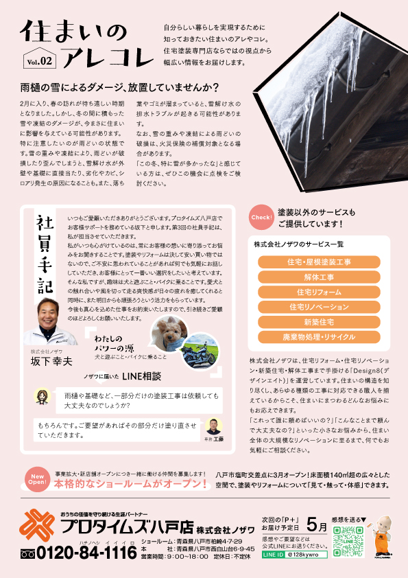 HOME ブログ 🎉 ニュースレター2026年2月号発刊のお知らせ スタッフブログ 🎉 ニュースレター2026年2月号発刊のお知らせ 2026.02.24 スタッフブログ みなさん こんにちは!八戸市の外壁塗装屋根塗装 外装リフォーム専門店の株式会社ノザワ プロタイムズ八戸店です! ご好評いただいたニュースレターの最新号が完成しました✨今回はビッグニュースがあります。なんと!新しくショールームができます!場所は塩町トンネル交差点角、元CDショップが入っていた場所です。3月のオープンに向けて着々と準備中です。お楽しみに!さらにスタッフの近況紹介など、読み応えたっぷりの内容です。お家のメンテナンスに関する情報や、ちょっとした暮らしのヒントも掲載していますので、お時間のあるときにぜひご覧ください😊近隣のお宅や店舗、オールウェイズ内でもお配りしています。見かけた際はぜひ手に取ってみてください📮みなさまからのご意見やご感想もお待ちしております! ニュースレターのダウンロードはこちら スタッフブログをご覧いただき ありがとうございます。青森県八戸市の塗装会社株式会社ノザワ(プロタイムズ八戸店)です。八戸市・八戸市近郊の屋根塗装・外壁塗装ならお任せください!塗装以外の外装リフォーム・内装リフォーム・雨漏りや室内リフォームなどのお家のお悩み事もノザワにお任せ下さい! 関連動画 思いを紹介 プロタイムズ紹介動画 プロタイムズ八戸店は外装劣化診断士のいるお店です♪ 調査、お見積は無料です。調査・お見積をしたからといって、プロタイムズに塗装工事を依頼しなければならないということはありません。八戸市の屋根塗装・外壁塗装・外装リフォームのご相談等お気軽にお問い合わせください! 最新記事 【新ショールーム】開所式を執り行いました 2026.3.6 外壁塗装の色選びはカラーシミュレーションで失敗を防ぐ 2026.2.24 新年度の入居者募集で“選ばれる物件”にするために~アパートオーナー様必見!屋根塗装の最適なタイミング~ 2026.2.19 カテゴリ スタッフブログ 新着情報 前の記事へ 一覧へ戻る 次の記事へ 関連記事 2025.10.30 スタッフブログ サイディング塗装で叶える!おしゃれで長持ちする外壁デザイン 2023.12.19 スタッフブログ ウッドデッキやログハウスに最適な塗料とは? 2024.7.17 スタッフブログ 猛暑対策は外装から見直し!遮熱塗装のススメ ピックアップPICKUP 塗装品質へのこだわり 有資格者による建物診断 わかりやすく納得の見積もり 屋根&外壁塗り替え勉強会