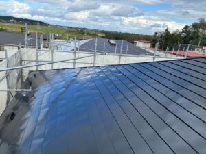屋根、外壁共に2液型のシリコン樹脂塗料を採用しました。下塗り材も2液型のエポキシ樹脂塗料を使用している為、下地への密着性も良く、強靭な塗膜で長期に渡り雨や紫外線などから家を守ります! 屋根上には落雪防止用のスノーキングが設置されていましたが、屋根を塗装する為、一度外して、塗装後に再取付けさせていただきました。 雨樋は一部傾いてしまっている部分があり、交換を実施、取付用の金具は発錆が目立っていたため全て新品に交換させていただきました。 現地調査の際にはそういった細かい部分にまで目を配り、最適なご提案をできるよう心掛けています。