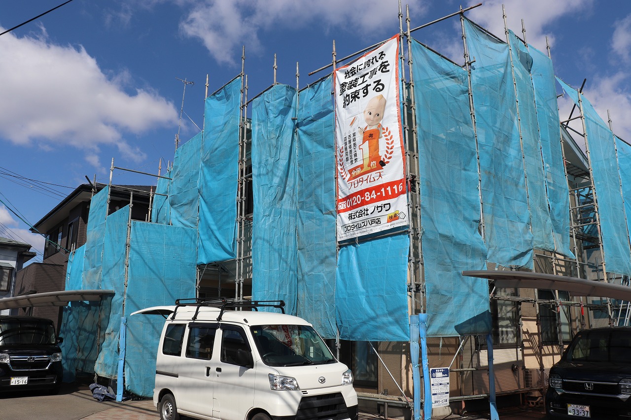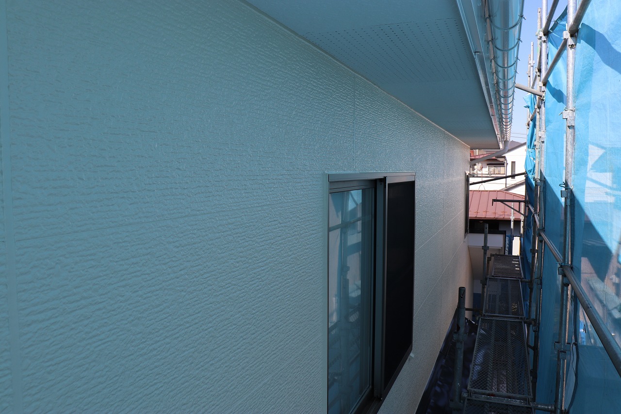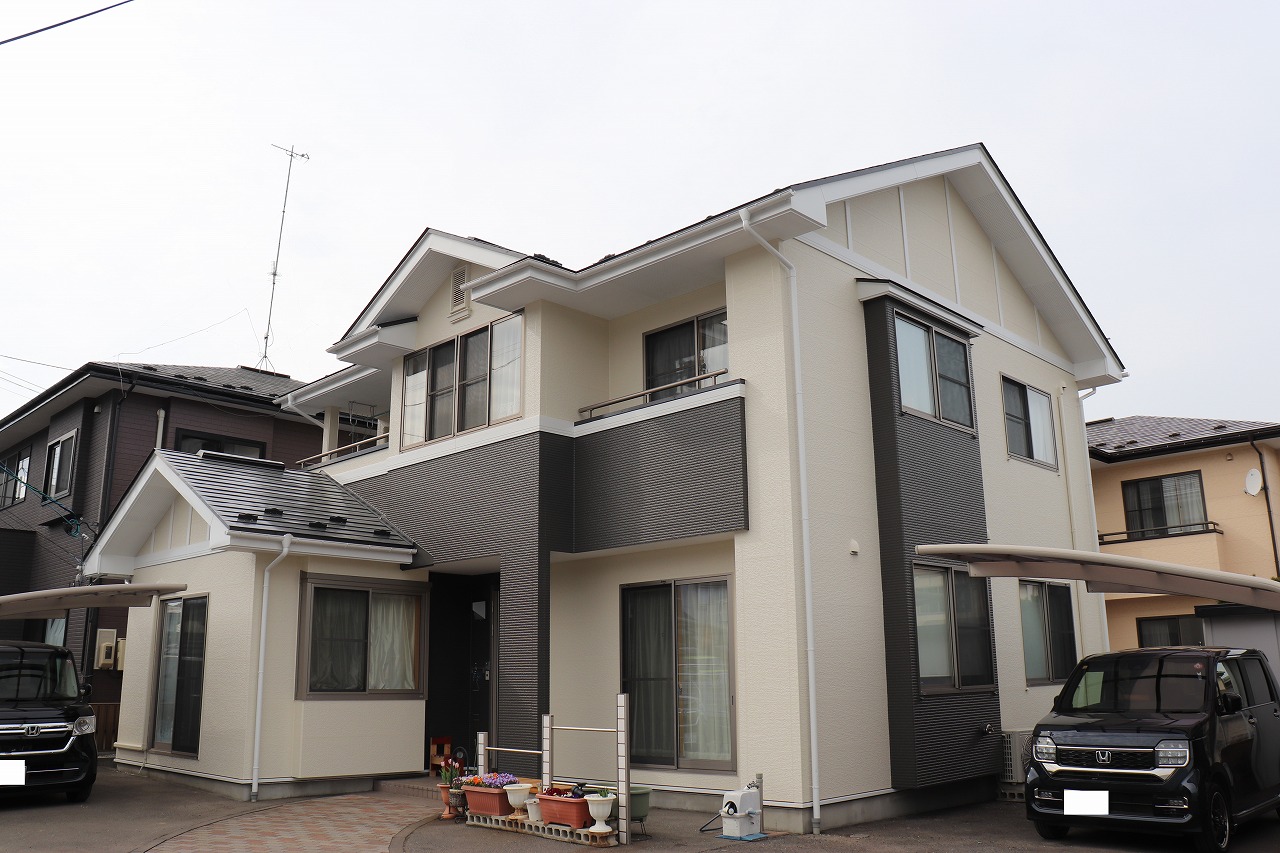 | 施工内容 | 屋根色 カーボングレー9111/破風雨樋幕帯色 シルキーホワイト8201/外壁色①メイン・ニュートラルホワイト8092、アクセント・ウィンザーコッパー8078 /幕帯 シルキーホワイト8201 |