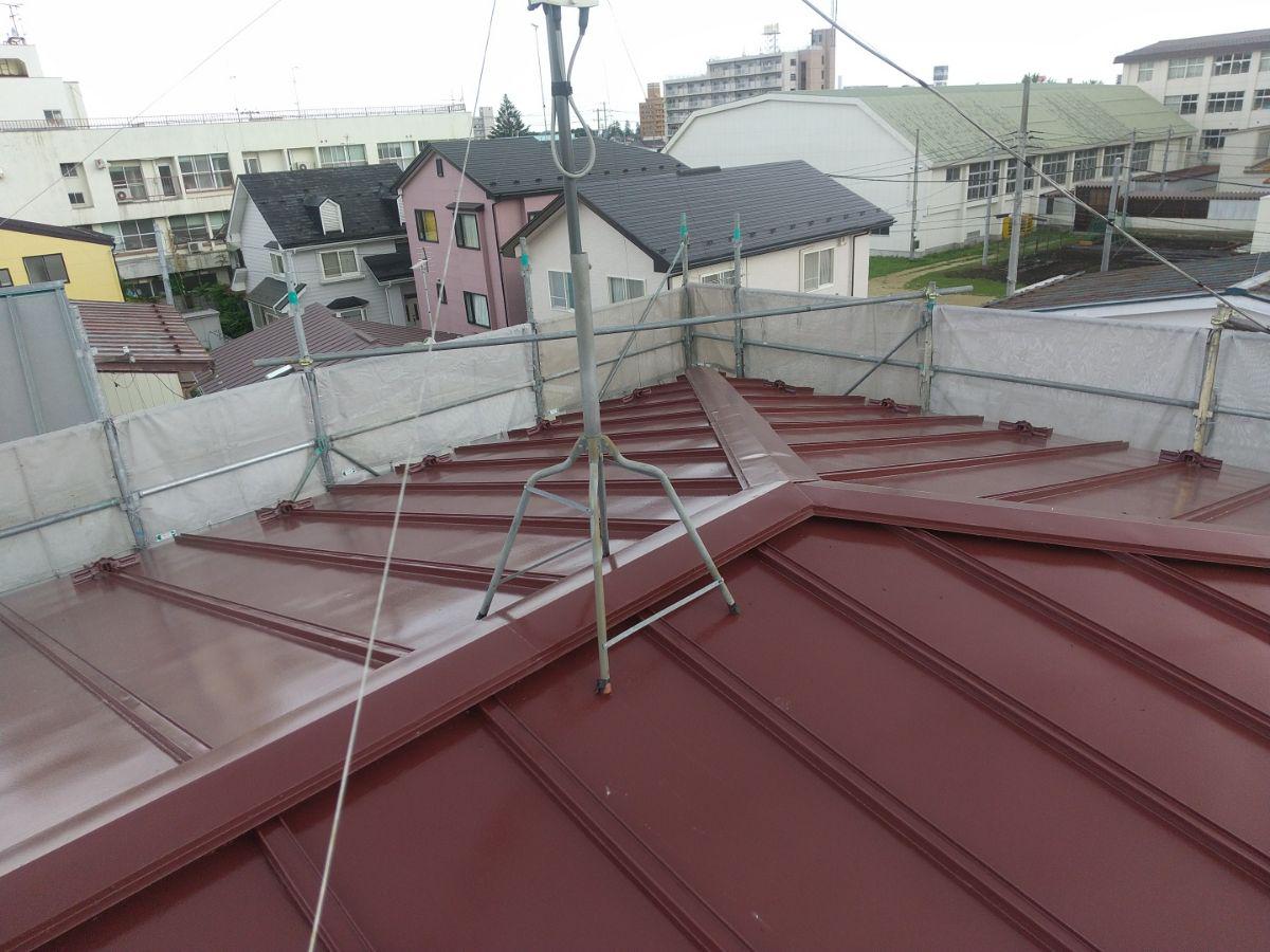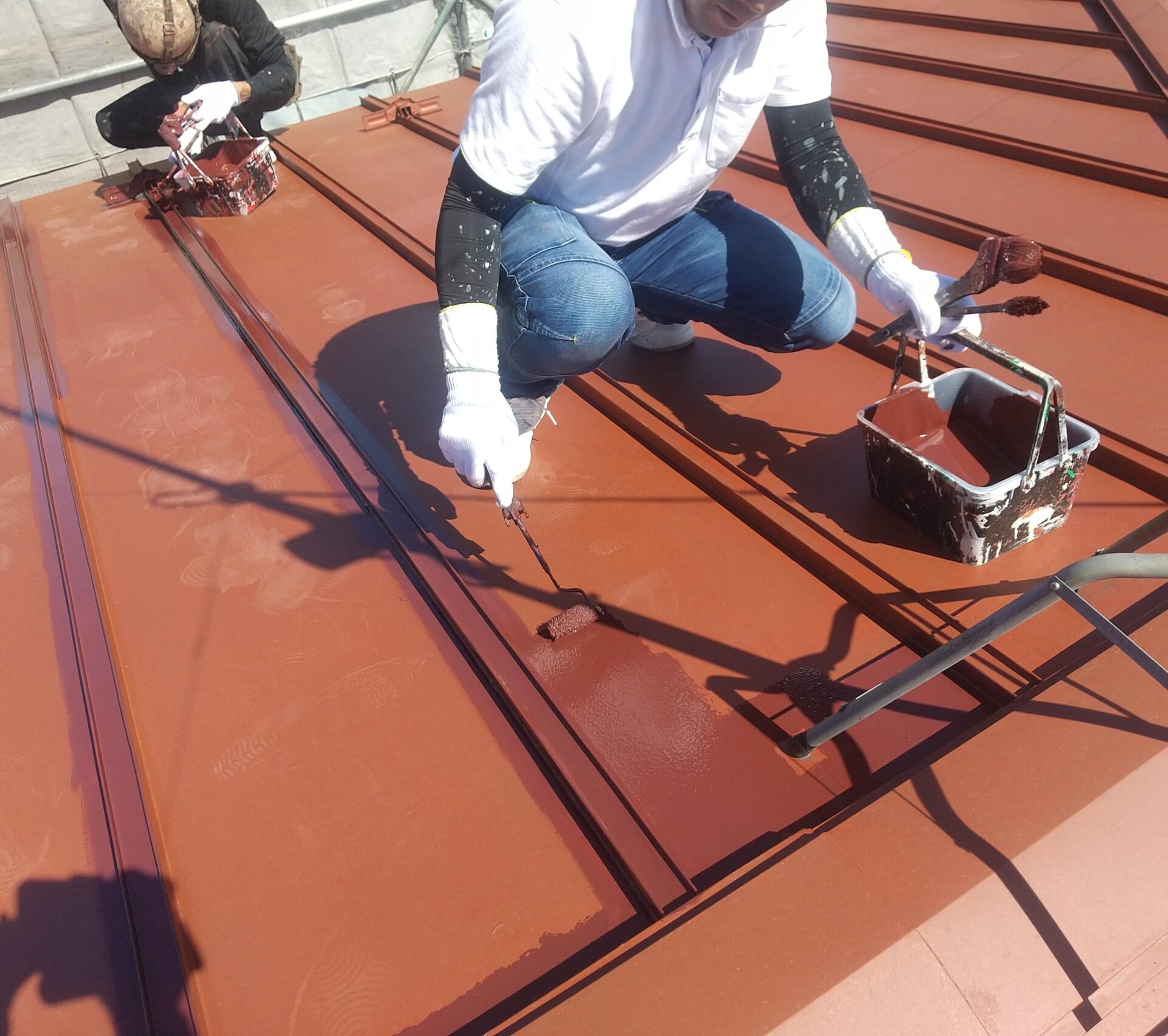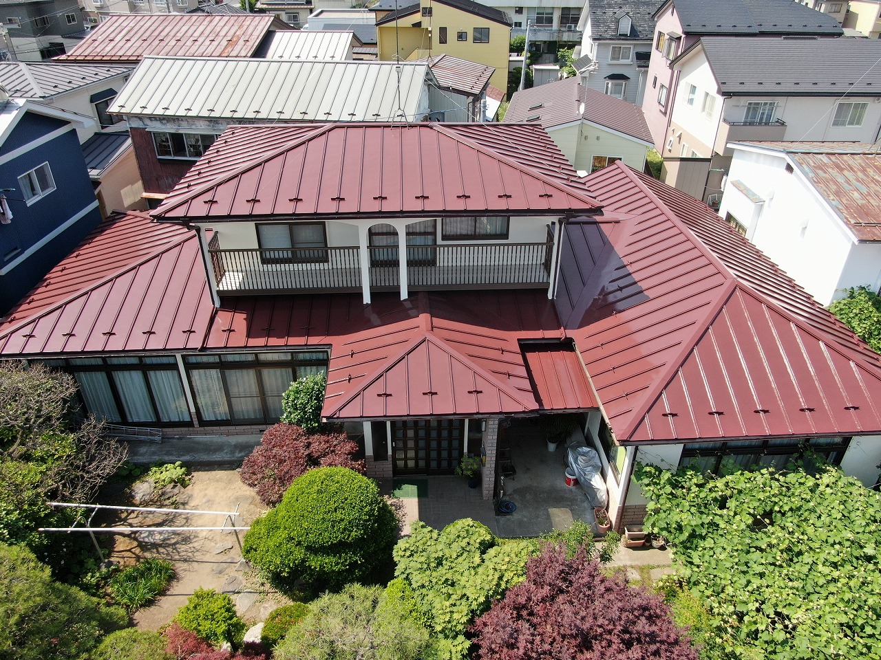 外壁は同系色、つややかな赤系カラーでお家の表情も明るい仕上がりに♪目視では分かりづらい屋根のてっぺんが下地まで見えている状態でしたが、しっかり3回塗りで対応させていただきました。