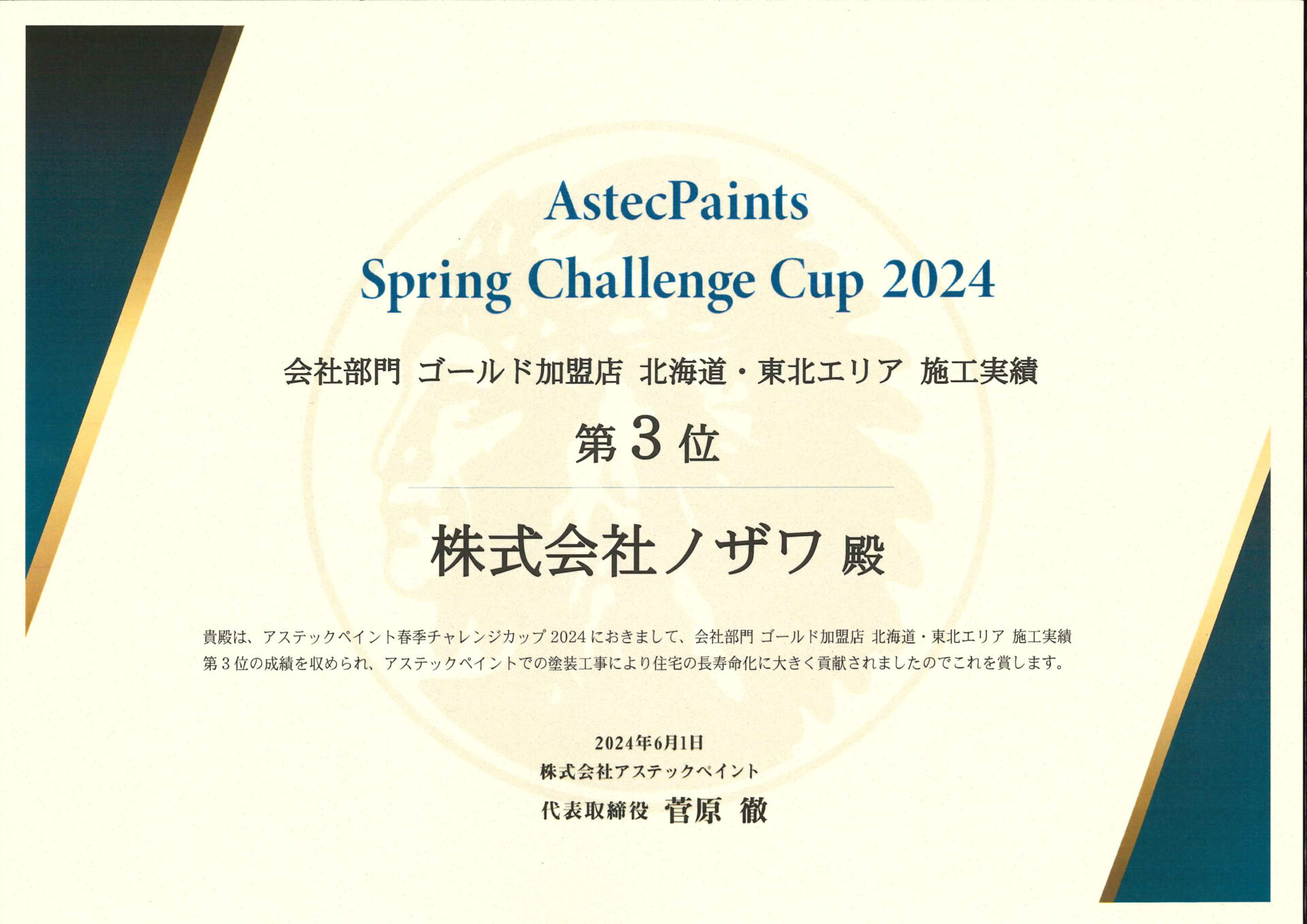 2024春季 会社部門 ゴールド加盟店 北海道・東北エリア 施工実績 第3位