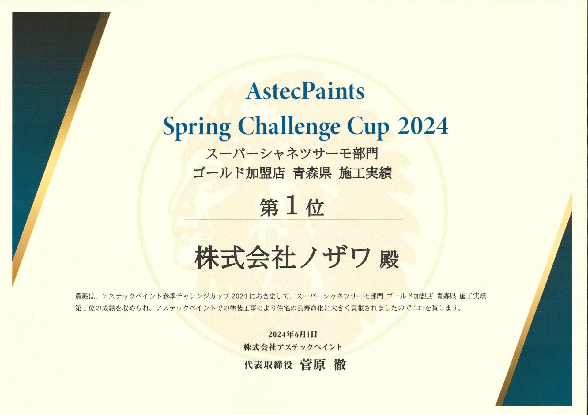 2024春季 スーパーシャネツサーモ部門 ゴールド加盟店 青森県 施工実績 第1位