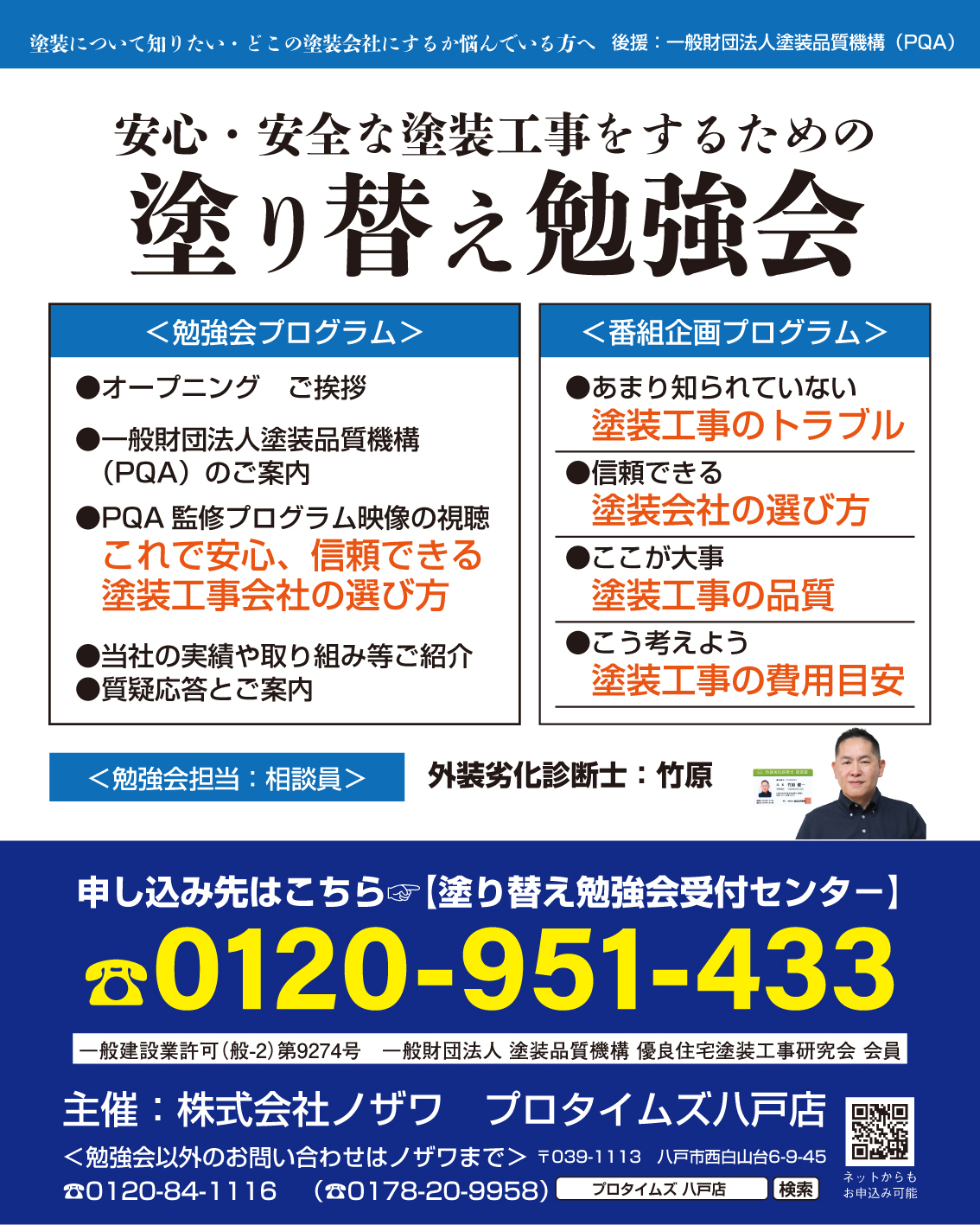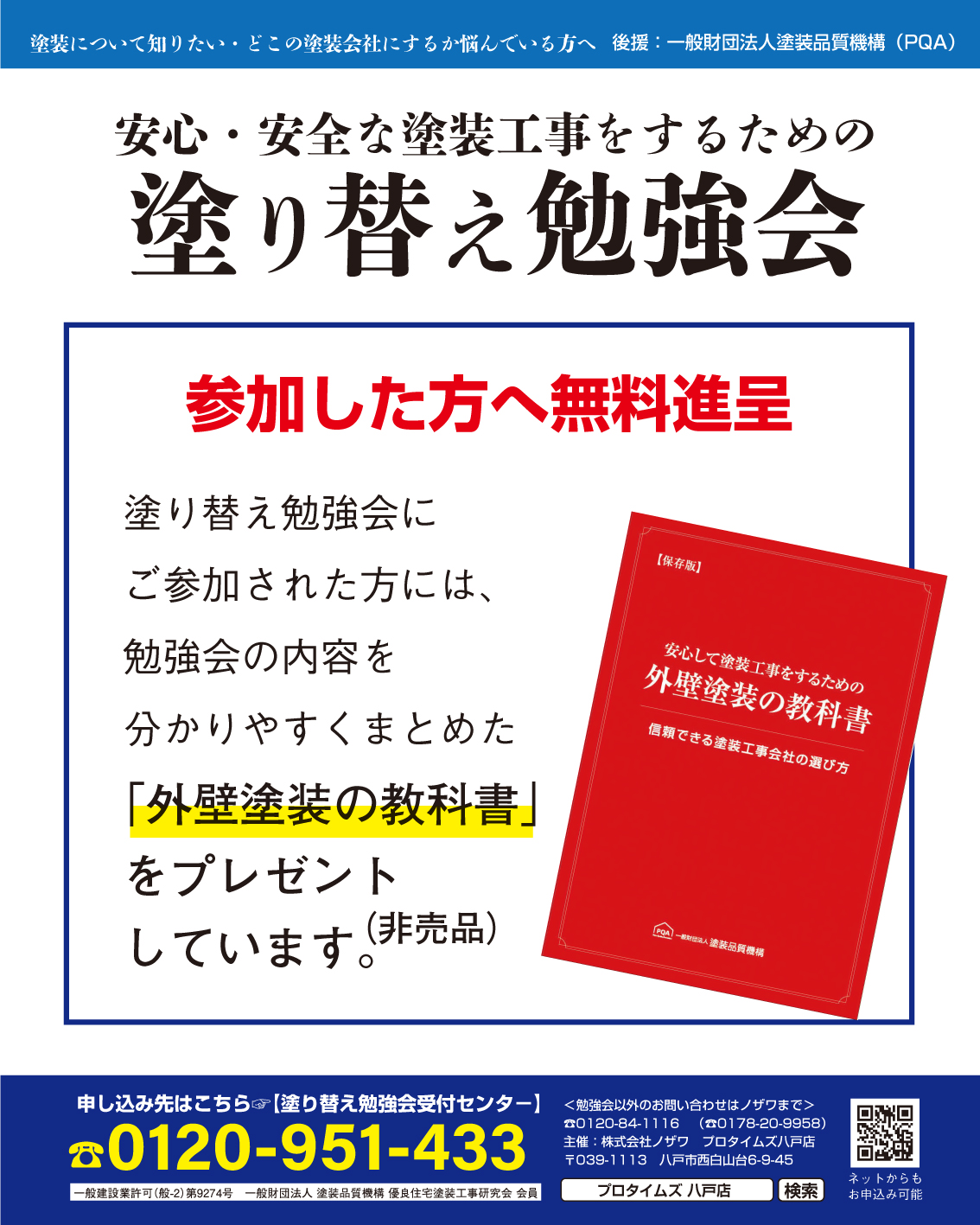 HOME イベント 塗り替えセミナー【2/21(土)】 塗り替えセミナー【2/21(土)】 開催日2026/02/21(土) 時 間10:00~12:00 カテゴリ塗り替えセミナー 場 所八戸ポータルミュージアムはっち ギャラリー3 イベント内容塗装業界では未だに、不良施工などのトラブルの発生が問題になってます。 本勉強会では一般財団法人塗装品質機構(PQA)が推奨する工事品質を確保するための「塗装工事の依頼方法」や「塗装工事の基準」「信頼できる塗装工事会社の選び方」など、優良住宅塗装研究会会員の私たちが、分かりやすく解説します。 イベント申し込み Japan お申し込みフォーム お名前 必須 例:塗装 太郎 住所 必須 例:000-0000 例:〇〇県〇〇市〇〇0丁目00-00 例:〇〇マンション000 ※空欄可 電話番号 例:09000000000 メールアドレス 必須 例:xxx@xxx.com お問い合わせ内容 ※ご自由にお書き下さい このサイトはreCAPTCHAによって保護されており、Google プライバシーポリシーと利用規約が適用されます。 ピックアップPICKUP 塗装品質へのこだわり 有資格者による建物診断 わかりやすく納得の見積もり 屋根&外壁塗り替え勉強会